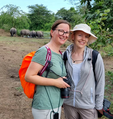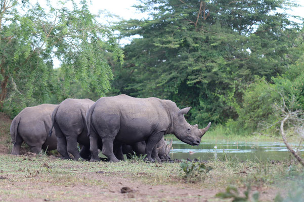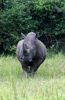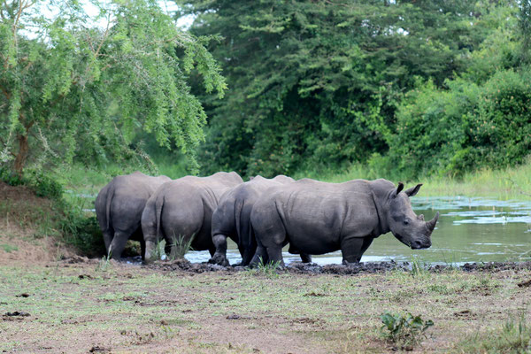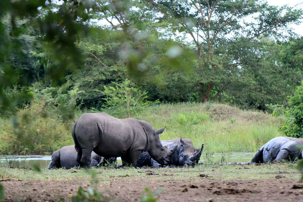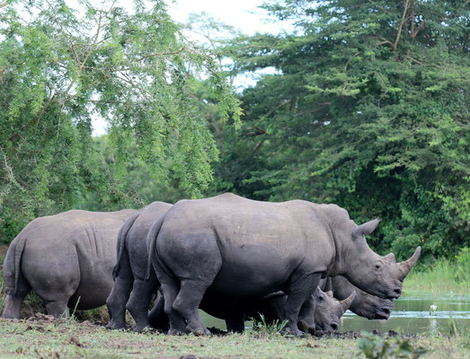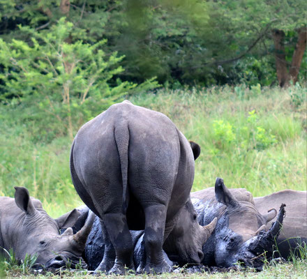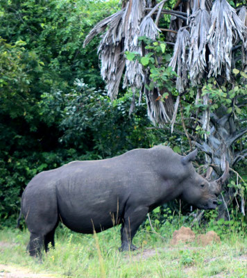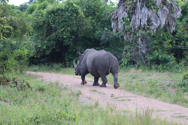 Wir haben einen Nashornbullen mit 3 Weibchen gesehen. !!! Eine Rarität. Eine ist wohl bald Paarungsbereit und deshalb schleicht der Bulle. Und alles aus ca 20 Metern Entfernung. Wir sind überwältigt.